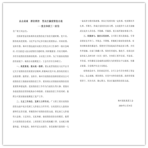 新年伊始,新型冠狀病毒疫情出現(xiàn)爆發(fā)之勢(shì)。疫情就是命令,防控就是責(zé)任。公司領(lǐng)導(dǎo)高度重視疫情發(fā)展趨勢(shì),于1月30日召開(kāi)林州重機(jī)疫情防控緊急會(huì)議,著手安排公司疫情防控工作。